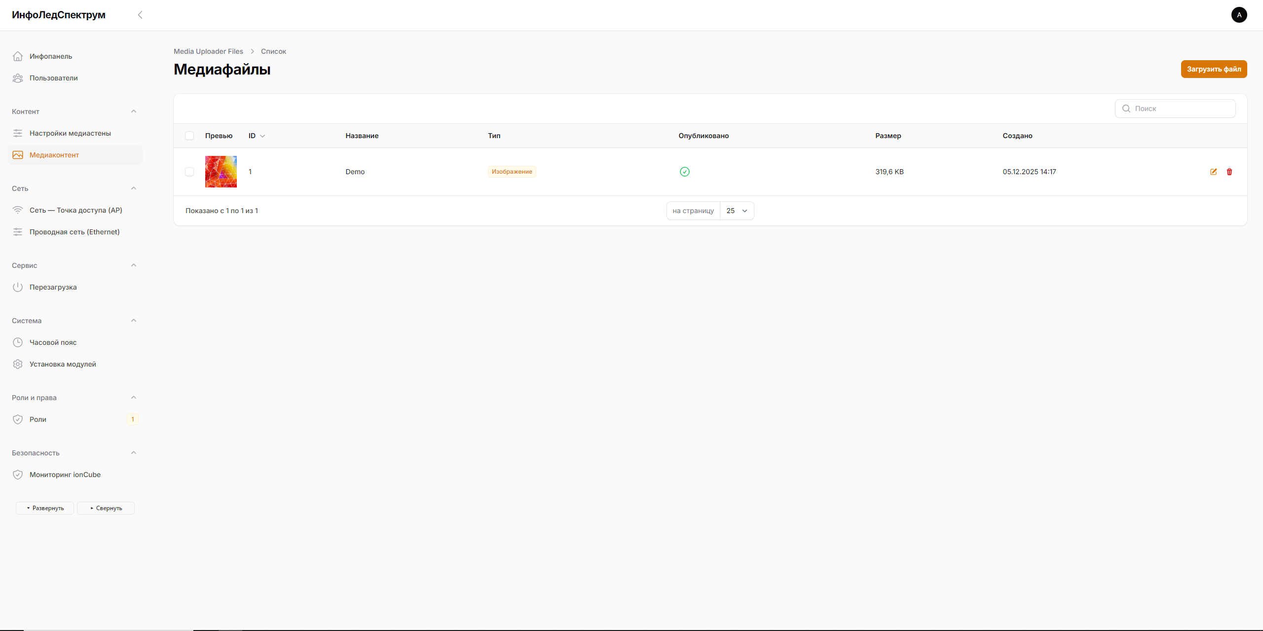 Модуль «Медиаконтент» используется для загрузки, управления и отображения изображений и видеороликов на LED-экранах системы ИнфоЛедСпектрум.
