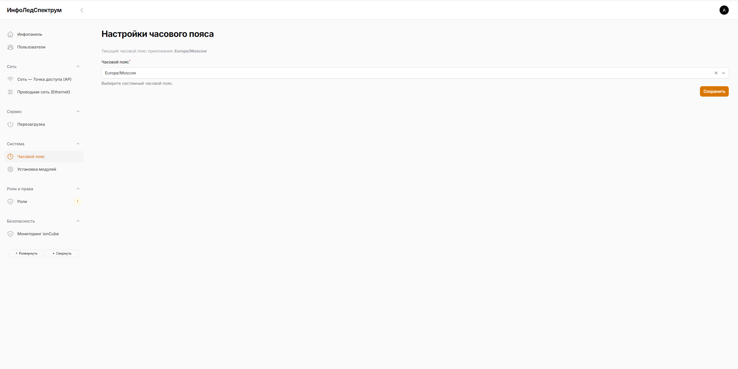 config('app.timezone')). - Часовой пояс (выпадающий список) — выбор нового часового пояса, который будет применён одновременно к приложению и операционной системе.