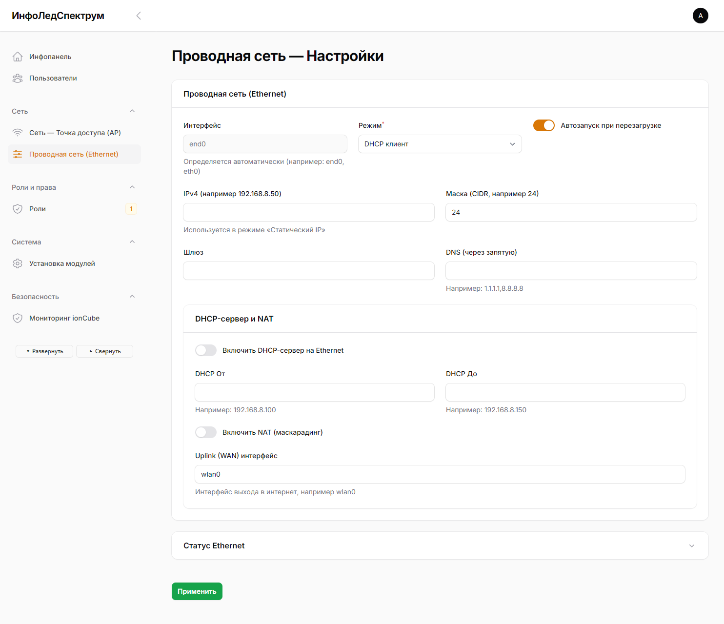 Документация страницы настройки Ethernet-интерфейса в админ‑панели ИнфоЛедСпектрум.